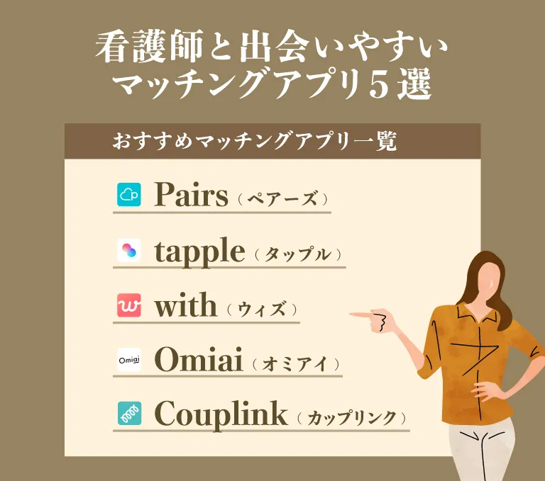 そこで、会員数の多さや利用しやすさから、看護師と出会いやすいマッチングアプリ5選を紹介します。