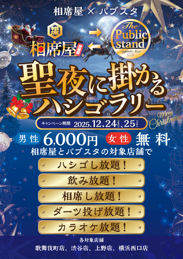 ※カラオケ歌い放題は相席屋歌舞伎町店、横浜西口店のVIPルームで、The Public standは渋谷店でご利用可能です。