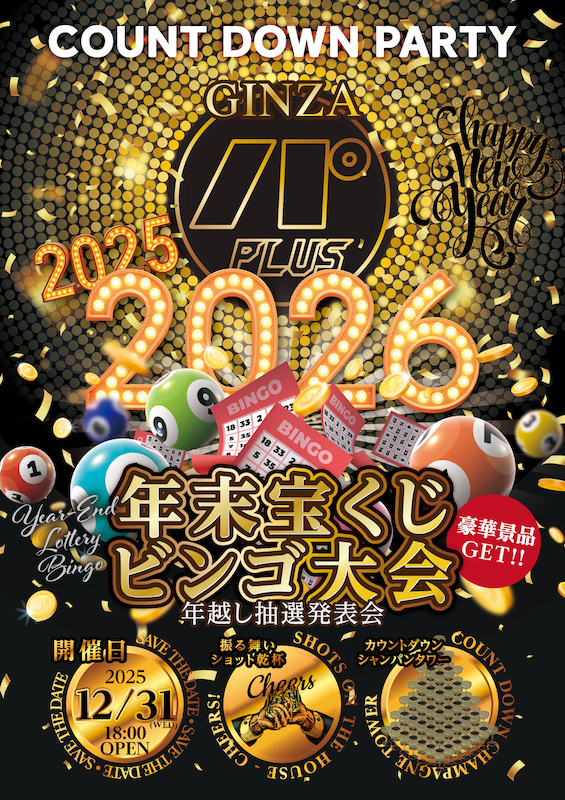 振る舞いショットやシャンパンタワーで新年最初にみんなで乾杯! 年末宝くじBINGO大会で新年最初の運試し!