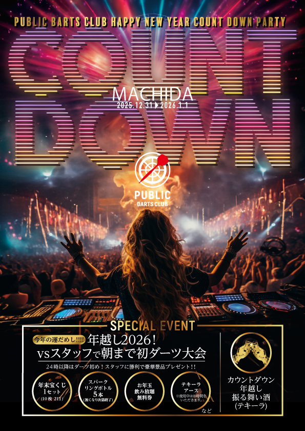 年越し2026!朝まで初ダーツ大会で運試し年! パブリックダーツクラブで新年2026カウントダウンパーティーを開催します!